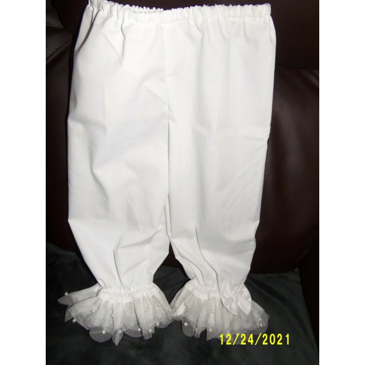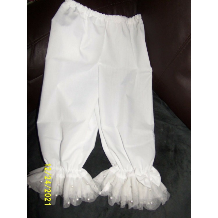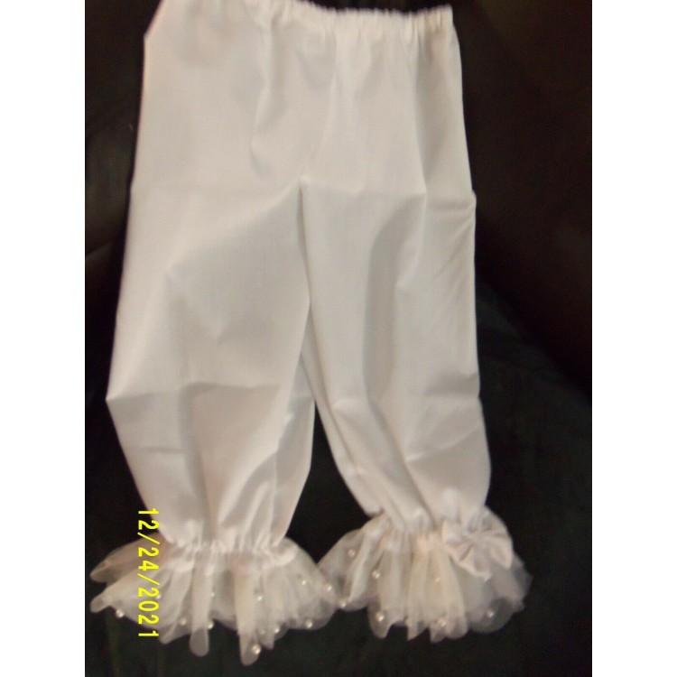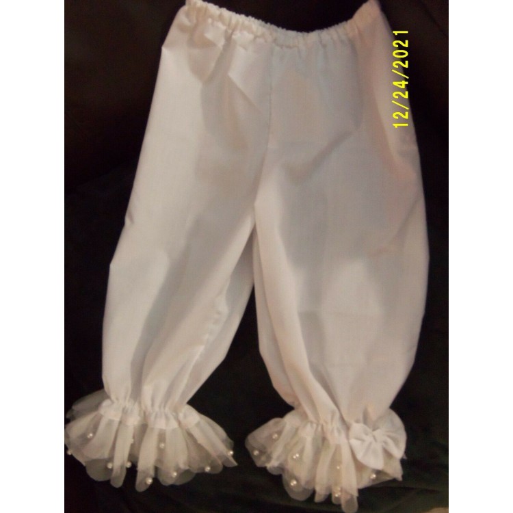 Under knee length White Bloomers w/Perl's Lace Bow on one side Size 3t-6t Cotton blend fabric for comfort and ease of care, and soft elastic . This listing is for white bloomers with lace trim at the leg hem. If you are interested in colors or prints, please email me with your request. All items come from my smoke free home. Please email me any questions you may have. Payment is due at time of purchase. I do combine shipping. Check my store often as I list new items regularly. Thank you! |